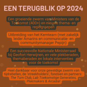 We blijven ons als Tijdrebellen en Ministers van de Toekomst inzetten voor intergenerationele rechtvaardigheid en brede welvaart. In deze post blikken we graag terug op onze successen van 2024 en blikken we vooruit op 2025 evenals de vele jaren en generaties die voor ons liggen! 🧡✊🌍